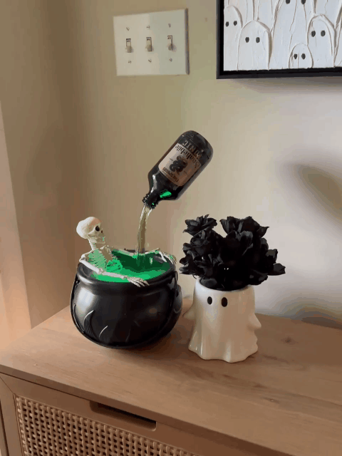 A potion bottle appears to float above your cauldron. Hidden stability tubes secure it while mist spills over edges—creating a spellbinding cauldron Halloween decor with eerie ambiance.