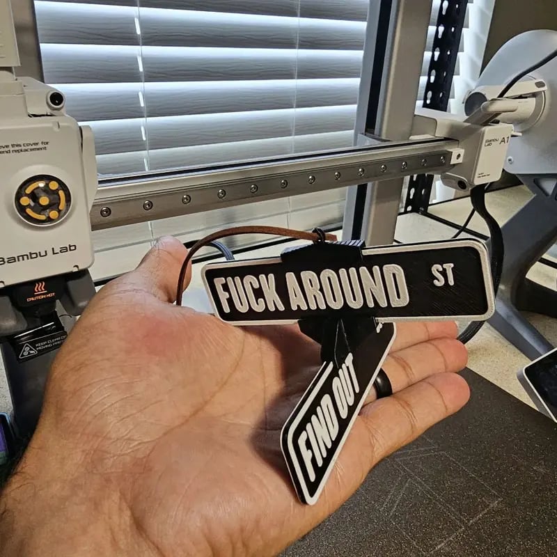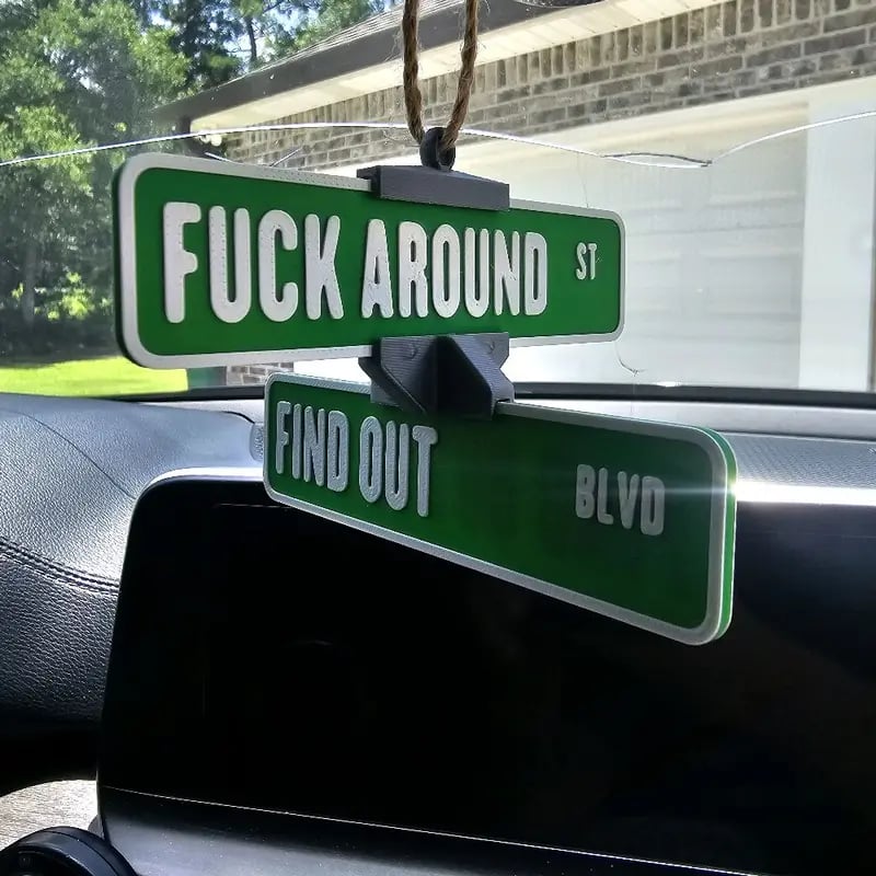 This 3D printed hanging 6" FAFO sign is perfect for your rear view mirror, shelves, or any space you fancy. It comes pre-strung with a leather string, making installation a breeze. Add a unique touch to your decor effortlessly.